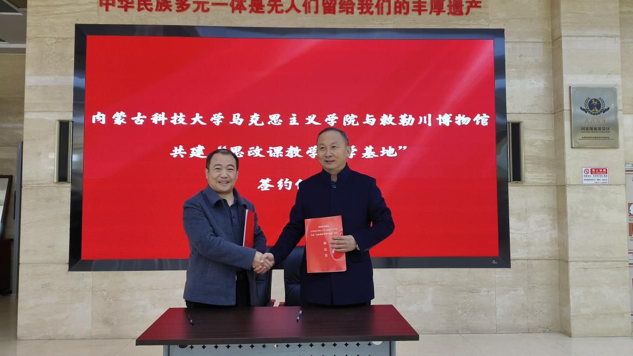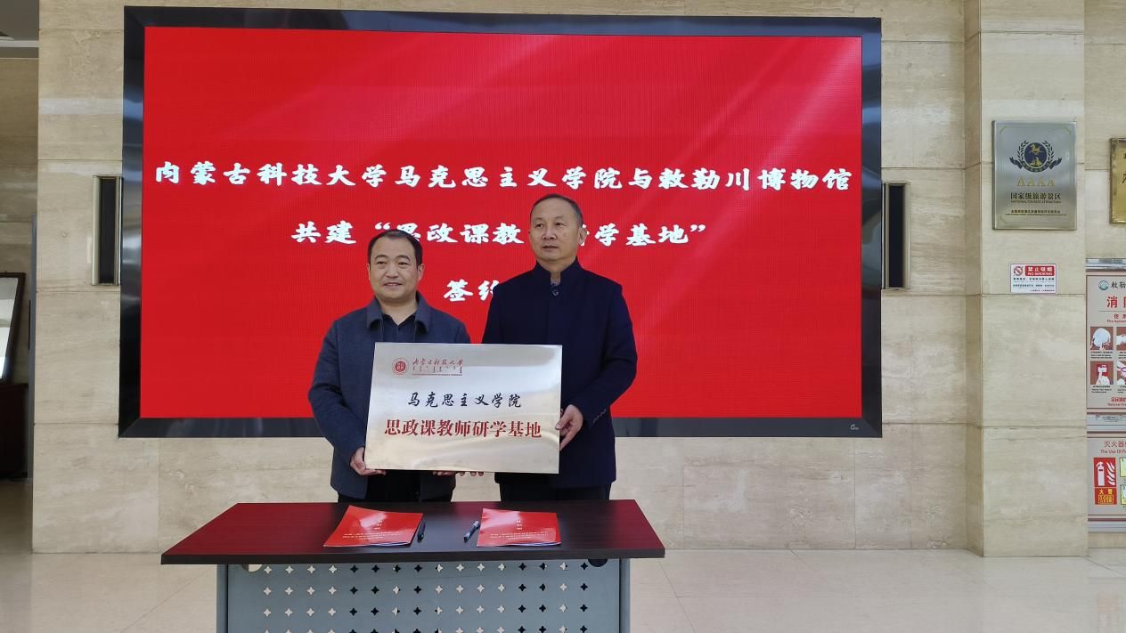 首先,太阳成集团官方网站副经理杨德桥与土右旗敕勒川博物馆馆长赵俊峰共同签署“思政课教师研学基地”共建协议,并举行授牌仪式。双方一致表示,太阳成集团tyc122ccvip在土右旗敕勒川博物馆设立“思政课教师研学基地”,通过一系列的合作共建举措,促进校地双向赋能、同频共振,力争在学习研究、实践教学、社会服务、精神传承、校馆合作等领域取得建设性的效果。