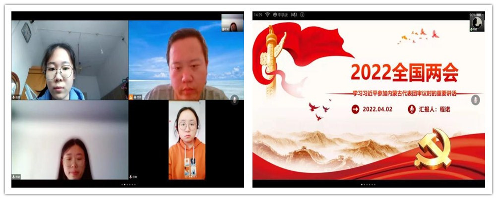 4月2日,员工党员程诺讲党课,主题为“2022全国两会 学习习近平参加内蒙古代表团审议时的重要讲话”。