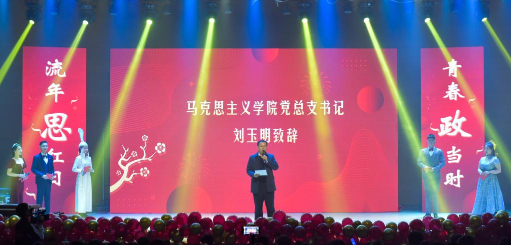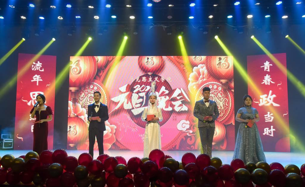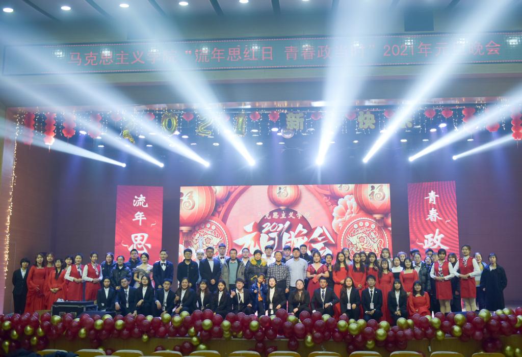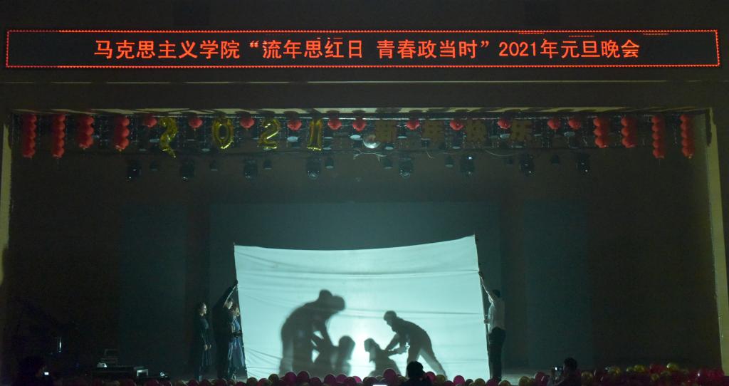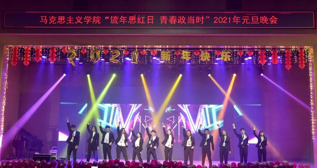 首先,公司党总支书记刘玉明致新年贺词。刘玉明在致辞中指出,在2020这个不平凡的一年,太阳成集团tyc122ccvip在党建工作、教学科研、学风建设、员工活动等方面,取得了优异的成绩,收获了丰硕的成果,并向为公司发展付出辛勤努力的老师和同学们表示衷心的感谢。刘玉明强调,举行盛大的“流年思红日 青春政当时”元旦晚会,就是为了更好地学习宣传贯彻习近平新时代中国特色社会主义思想,更好地传播马列主义,更好地坚定文化自信,为马院师生点赞,并向全体师生送上美好的新年祝福。紧接着,晚会在嗨翻全场的开场舞中拉开帷幕。本次元旦晚会共分为“流年思红日”、“青春政当时”两个篇章。