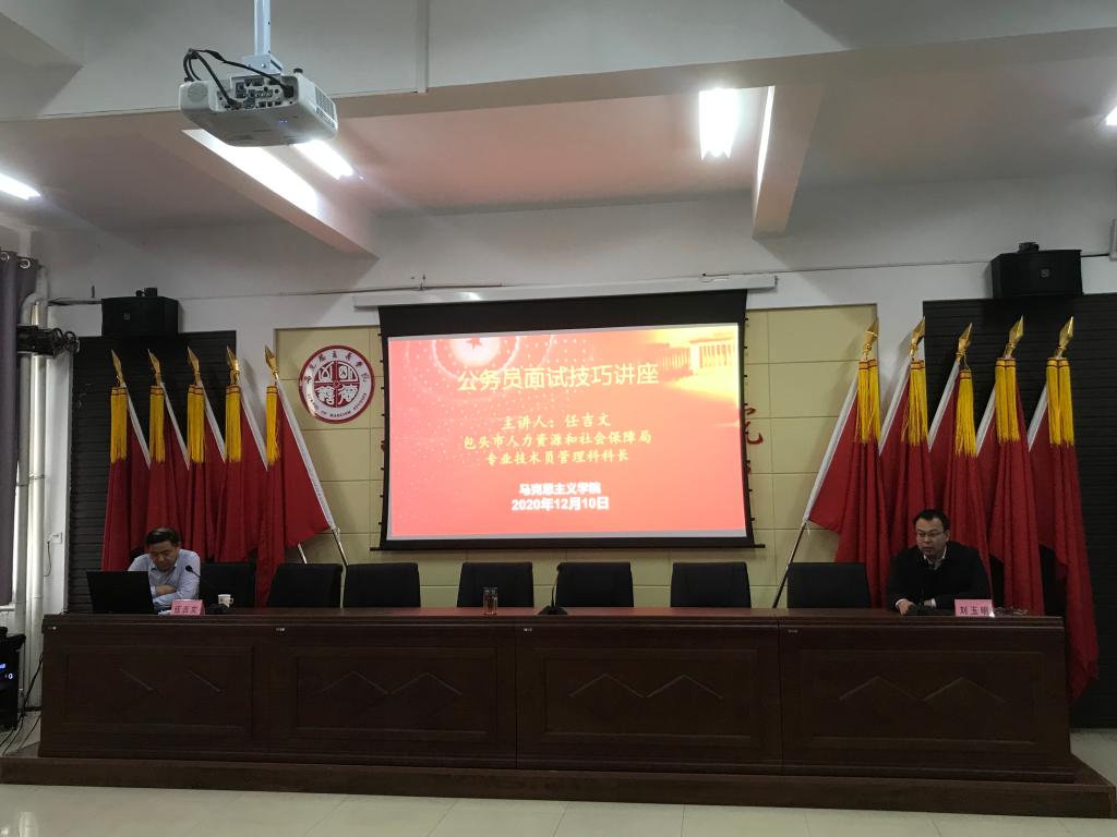 为进一步做好毕业生就业工作,12月10日下午4:30,太阳成集团tyc122ccvip在腾飞楼C509会议室举办毕业生就业专题讲座,邀请包头市人力资源和社会保障局专业技术员管理科科长任吉文作了题为《机关事业单位考录应试技巧》专题讲座。公司党总支书记刘玉明,辅导员王海朋、焦刚,2017级思政、研究生全体员工参加本次讲座。讲座由公司党总支书记刘玉明主持。