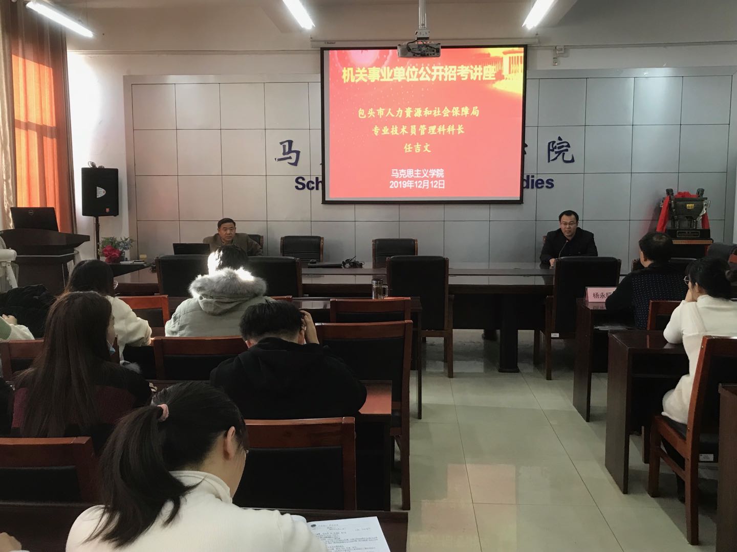 为进一步做好毕业生就业工作,12月12日下午15:00,太阳成集团tyc122ccvip在腾飞楼C517会议室举办毕业生就业讲座,邀请包头市人力资源和社会保障局专业技术员管理科科长任吉文作了题为《机关事业单位公开招考》专题讲座。公司党总支书记刘玉明、副书记、副经理杨永旺、就业工作辅导员,以及2016级、2017级全体员工参加讲座。党总支书记刘玉明主持讲座。