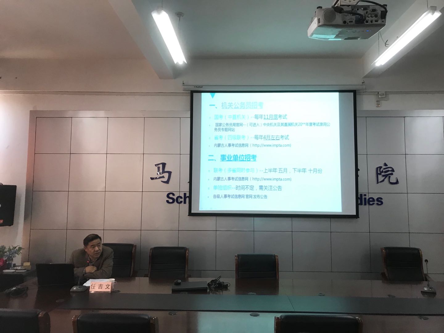 任吉文首先介绍了当前的就业形势,分析了思想政治教育专业的就业前景。接下来任吉文以公务员招考、事业单位招考为切入点,主要介绍了相关的细节问题、面试技巧,鼓励同学们从平时做起,注重锻炼相关能力,提高自身综合素质,为将来就业做好充足的准备。